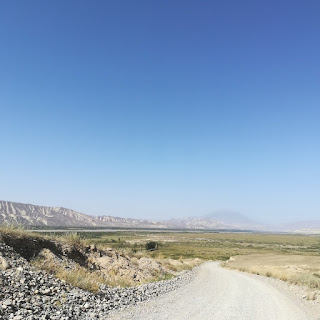 Partiamo lasciandoci alle spalle il paesino di Ak-Kya. A parte qualche saliscendi, i primi 20km sono quasi tutti in piano, accanto al fiume, sotto ad un cielo d'azzurro steso. Peccato che il fondo sia orribile di sassini che sballottano il cervello nella scatola cranica e costringono il corpo ad uno sforzo continuo ed estenuante per tenere in piedi la Signora ed il suo culo pesante.