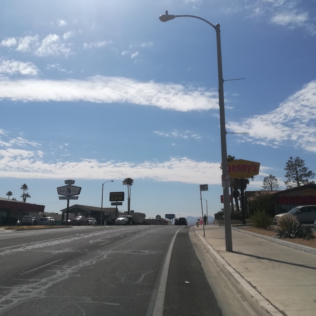 In breve, però, la città finisce e cede il passo di nuovo al deserto sconfinato. In realtà noi stiamo passando proprio sul confine tra due deserti, che qui si sfiorano e accarezzano con diverse sabbie e venti che portano all'uno i caldi sussurri dell'altro. Qui infatti passiamo tra il deserto Mojave, a nord, e il Sonora, a sud.