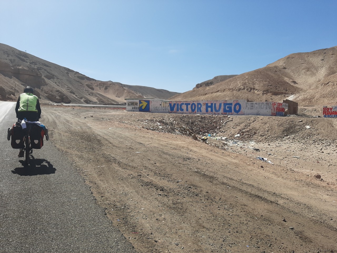 Si sale nel sole rovente. La strada non è mai troppo ripida, ma abbastanza da costringere ad andature appena sufficienti a mantenersi in equilibrio sulle due ruote. A tratti è vuota, a tratti impestata di un traffico rumorosissimo di mezzi pesanti di ogni genere. Non mancano, nemmeno qui, muertitos e auto minuscole grandi carichi. Sono sacchi pieni di bottiglie di plastica, raccolte tra i rifiuti a bordo strada e poi rivendute.