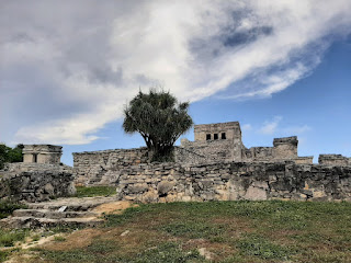 Raggiungiamo finalmente. dopo 3km di abbrustolimento, il punto di accesso alle rovine e, da lì, camminiamo ancora per 3km, facendo lo slalom tra finti addetti al sito, che cercano di vendere il loro tour privati, e un labirinto di negozietti e baracchini di souvenir e parafernalia con sombrero e baffi. Stiamo diventando più abili nel districarci, ma la camminata su sterrato tra le mangrovie ci annebbia comunque i già rallentati cervellini. Non ci facciamo abbindolare ma sbagliamo strada, anche perchè qui è tutto un cantiere aperto con decine di operai che buttano giù asfalto rovente; camminiamo tantissimo, poi ancora e ancora per tornare indietro e raggiungere le ruinas vere e proprie. Scopriamo subito che ne è valsa la pena.