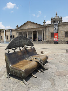 Arriviamo, in un questo clima festoso e vacanziero, all'Instituto cultural de Cabañas, gioiello architettonico e Patrimonio UNESCO. Anche la piazza antistante è colma di installazioni artistiche permanenti, che la gente ammira e usa anche per riposare, trattandosi spesso di panchine o sedute.