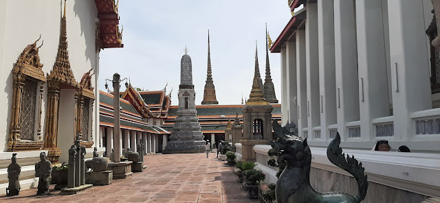 Si confermano intanto tutte le percezioni di ieri: è tutto molto più tranquillo e ordinato e silenzioso del previsto. Arriviamo al Wat Pho, dunque, e siamo preparati: spalle coperte, pantaloni lunghi: qui il dress code viene fatto rispettare con rigore nei luoghi sacri. Questo tempio vanta numerosi primati: il Buddha sdraiato più grande della città, la più imponente collezione di statue di Buddha di tutta la Thailandia e il fatto di esser stato il primo centro deputato alla pubblica istruzione nel paese. Il primo tempio sorto in quest'area risale al 1700, ed era più modesto, per quanto importantissimo: era il centro di studio e insegnamento della medicina tradizionale, che comprende i famosi massaggi thai; ancora oggi questa arte viene divulgata qui, ed è presente anche un museo dedicato, oltre a numerose statue dell'epoca raffiguranti le posizioni dello yoga. I lavori più importanti furono eseguiti dal 1788, sotto al regno di re Rama I (oggi è al trono Rama X) e poi ampliati da Rama III, che aggiunse oltre 1300 targhe, oggi patrimonio UNESCO, che custodiscono insegnamenti di medicina e buddhisti. Raccapezzarsi negli oltre 80.000 metri quadrati di complesso non è facile.